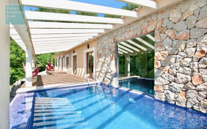 Finca in Esporles zu verkaufen! Angrenzend an das Naturschutzgebiet der Tramuntana Ausläufer befindet sich die Finca auf einem ca. 50.000 m² grossem Grundstück. Das Haus im Bungalowstil hat eine Wohnfläche von ca. 250 m² Wohnfläche mit insgesamt 5 Schlafzimmer und 4 Bäder, davon eines en Suite. Der offen gestaltete Wohn/Essbereich mit offenem Kamin über zwei Ebenen, lädt zum verweilen ein und bietet direkten Zugang auf die Sonnenterrasse in Hanglage und einem traumhaften Blick in die umliegende Natur. Hier befindet sich auch der ca. 4 x 5 Meter grosse und beheizbare Pool. Im hinteren Bereich des Hauses befinden sich die Schlafzimmer, das Hauptschlafzimmer mit Ankleide und Bad en Suite. Die Mallorca Immobilie liegt in einer absoluten Idylle, Wald soweit das Auge reicht. Zur weiteren Ausstattung gehören: Öl-Zentralheizung, öffentlicher Stromanschluss, Isolierverglasung, Kamin im Wohnzimmer, Klimaanlage, eigener Brunnen, Telefon, Internet und TV.