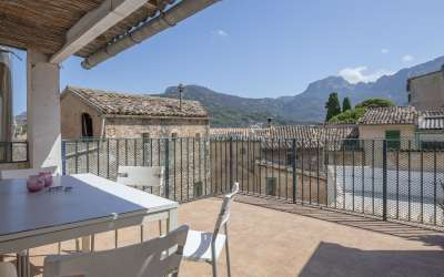 SÒLLER, Stadthaus in zentrale Lage mit separater Souterrain-Wohnung, Patio und Dachterrasse mit Blick über die Dächer und auf die Berge der Tramu...