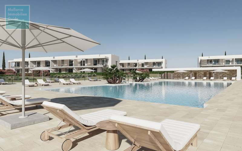 Apartment for sale in Sa Rápita! The apartment for sale is on the ground floor of a complex under construction close to Sa Rápita. The complex is close to the Es Trenc beach and in an absolutely quiet area. The ground floor apartment has a constructed area of about 94 m² with 2 bedrooms, 2 bathrooms, one of which is en-suite, living-dining room, fully fitted kitchen, laundry room and a garden of about 55 m². The promotion includes 9 two storey buildings with a total of 69 apartments, measuring between 94 and about 115 m² (constructed area) and with two or 3 bedrooms. The ground floor apartments have a private garden, the first floor apartments offer roof terraces of about 70 m² to 115 m². The complex includes a large community area with sundeck and pool. Further features include fully fitted kitchen, air-conditioning, double-glazed windows, electric underfloor heating in the bathrooms, landline, internet and television, parking space and a storage room per apartment. Prices range from € 490.000 up to € 698.000. Delivery is scheduled for November 2024.
