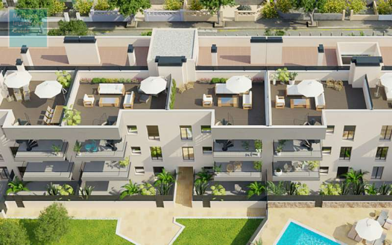 New build apartment for sale in Porto Cristo! The 2-storey, modern residential complex is located in a quiet residential area, only approx. 700 meters from the fine sandy beach in Porto Cristo. A total of 18 apartments with 2 or 3 bedrooms, 2 bathrooms, living-dining room, open kitchen with utility room, balconies and terraces are being built. Each apartment has at least one of the 30 underground parking spaces and a storage room. The apartments on the first floor all have a spacious terrace and some have their own private garden. Two of the upper apartments (aticos) also have a large private roof terrace. The apartment offered here is located on the 2nd UPPER FLOOR with approx. 11 m² balcony and a living area of approx. 90 with a total of 2 bedrooms and 2 bathrooms. The new-build apartments are part of a construction project by a very renowned developer on the island. Its properties are characterized by high construction quality and finish. The fixtures and fittings are extensive and always state of the art. Further features of the apartment in Porto Cristo include: Underfloor heating, air conditioning, heat pump, pre-installed LED lighting in the hallway, bathrooms and kitchen, bathrooms equipped with shower tray, single-lever mixer taps, washbasin with suspended vanity unit and suspended WC, security/entrance doors, double glazing with casement windows and electric shutters in the bedrooms and sliding/patio doors in the living room, SAT TV, intercom system, elevator to the underground garage, underground parking space with storage room, decalcification system and communal pool.