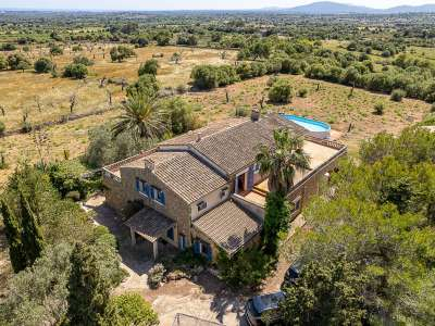 Finca for sale in Mallorca. The large country house is situated between Son Carrio and Porto Cristo in an absolutely quiet location on a south-facing plot of approx. 11,600 m². The country house offers a living space of approx. 400 m² on 2 floors with a total of 6 bedrooms and 6 bathrooms, two of which are en suite. The property impresses with its elevated position and a separate agricultural area with olive trees. The outside area of the house offers an above-ground pool, spacious covered terraces, a separate casita with the finca's building services and additional storage space as well as a carport for 2 cars. On the GROUND FLOOR are the entrance area, the guest bathroom with shower, the spacious living/dining room with floor-to-ceiling windows in the front living area and access to the covered terrace. Another living room provides access to the two bedrooms on the ground floor, which share a bathroom. The kitchen is spacious, modern and fully equipped and has a utility room. Upstairs there are four bedrooms and four bathrooms, three of which are en suite. All bathrooms have a shower. The fourth bathroom also has a bathtub. Two of the bedrooms and the hallway have access to the U-shaped open terrace. The master bedroom has its own air conditioning.
