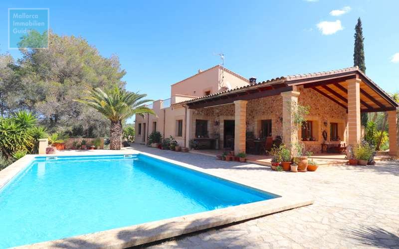 Finca for sale in Porto Cristo! Very comfortable country house with a plot of about 16.496 m² and total privacy. The house has two floors and a living area of approximately 230 m², 3 bedrooms and 2 bathrooms, one of which is en-suite. Groundfloor distribution: main bedroom, large guest room, living/dining room with an open-plan kitchen, guest toilet, covered terraces. First floor distribution: independent studio apartment with kitchen and private entrance over an inner or outer staircase, another bedroom with bathroom en-suite. The house has a lush, landscaped garden with herb garden and a pool of about 10 x 5 meters with Roman steps, a pool house with toilet, a wood burning oven and a sauna as well as a carport for 2 cars, a workshop and a shed. Further features include: public electricity, oil central heating, double-glazed windows, fully fitted kitchen, laundry room, carport, workshop and a shed. Large pool of about 10 x 5 meters, pool house with toilet, sauna, BBQ and outdoor shower. Proper well, large cistern and solar panels.