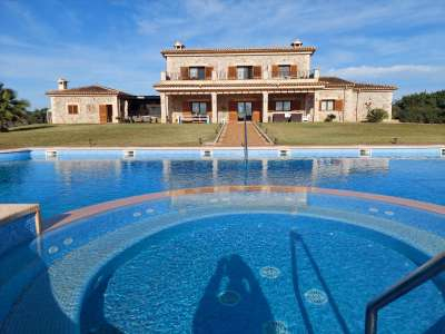 Llucmajor, finca for sale. This elegant country house was built with great attention to detail and is situated in a quiet rural location with good connections to Llucmajor. The plot has a size of approx. 22,000 m². The property offers a net living area of approx. 399 m² on two floors with a total of 4 bedrooms and 4 bathrooms en suite. On the GROUND FLOOR with patio is the impressive entrance hall, the spacious living/dining room with fireplace with high-quality Mares stone arches and the open-plan kitchen. In a separate wing there are three bedrooms, each with its own bathroom. On the UPPER FLOOR, designed as a large suite, is the master bedroom with living room, fireplace, dressing room and bathroom with sauna. A large open terrace offers breathtaking views over the countryside to the island of Cabrera. All rooms are spacious and bright. Adjacent to the main house with direct access is the approx. 90 m² garage with space for three vehicles and a guest WC with shower. On the pool side, adjacent to the living room, there is a large, covered terrace area with a fully equipped summer kitchen and outdoor living area. The swimming pool with jacuzzi is huge at 21 x 9 metres and gives the property its exclusive touch. Further features include: Own well and two additional underground cisterns, public electricity and internet connection, gas underfloor heating, central air conditioning hot/cold, double-glazed PVC windows and doors, natural stone floors, ETV licence for commercial holiday rentals, telephone, internet and TV connection. Outside there are numerous citrus and almond trees, olive trees and vines.