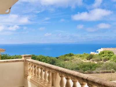 Semi-detached house for sale in Bahia Blava. The house is set in a quiet location and only about 15 minutes away from the Palma de Mallorca. The house has a plot of about 380 m² and a living area of approximately 160 m² and offers magnificent sea views. It has 3 bedrooms and 2 bathrooms, one of which is en suite, and a guest toilet. A great benefit is the independent guest studio apartment with its private entrance, access to the pool terrace, kitchen and a shower room. The ground floor offers a partially open and fully equipped kitchen with breakfast bar, a cozy living/dining area with an open fireplace and direct access to a terrace with spectacular sea views and the pool area. Upstairs are three bedrooms and two bathrooms. Two have access to a balcony on the front with partial sea views. The master bedroom with bathroom en suite has its private balcony with views to the Palma bay. Finally there is a small roof terrace with fantastic panoramic views of the sea and up to the Tramontana mountains. Further features include: double-glazed windows, air-conditioning, modern and fully equipped kitchen, living room with open fireplace, pool, landline, internet and television.