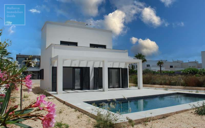 Majorca, detached house for sale in Cala Pi. The detached house was completed in 2022 and is located in an absolutely quiet area on a plot of approx. 665 m² with sea view and south orientation. The property in the south of Mallorca offers on two floors a living area of approx. 140 m² with a total of 3 bedrooms and 3 bathrooms. On the GROUND FLOOR there is the large and bright living-dining room with pre-installation for the kitchen, a bedroom with built-in wardrobe, a bathroom, as well as a room for the washing machine/dryer, where the heat pump is also located. From the living room you have access to the outside area with terrace with pergola and the approximately 8 x 3 metre salt water pool. On the UPPER FLOOR there are two further bedrooms, each with bathroom en suite and electric shutters on the windows. Both bedrooms have access to a spacious terrace with sea view. From the roof terrace you also have a fantastic view of the sea. Further features include: Underfloor heating, heat pump, air conditioning and solar panels, double glazing, pre-installation for the kitchen, 8 x 3 metre pool.