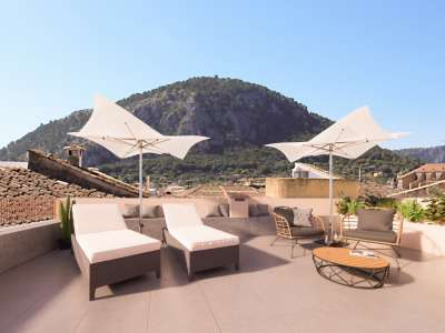 Renovated town house for sale in Pollensa. The old house from the 19th century is situated slightly above the centre of the old town, approx. 2 minutes from Pollensa's Plaza Mayor. The house offers on 2 floors, plus roof terrace, a living area of approx. 185 m² with a total of 3 bedrooms and 3 bathrooms, each en suite. On the GROUND FLOOR is the kitchen, the large living-dining room with access to the patio with small pool and a bedroom with en suite bathroom. On the FIRST FLOOR is the master bedroom with en suite bathroom, dressing room and private terrace on the patio, which is connected to the kitchen on the GROUND FLOOR via a dumb waiter. The third bedroom, also with en suite bathroom, is also located on this level. The upper floor provides access to the roof terrace with spectacular views of the church, Puig Maria and the Tramuntana mountains. The roof terrace has an outdoor shower, a bar area with fridge, built-in seating and plenty of space for sunbathing. Further features include: Underfloor heating, air conditioning hot/cold, double glazing, lift, designer kitchen, patio with small pool terrace by the master bedroom on the upper floor, roof terrace, telephone, internet and TV connection.