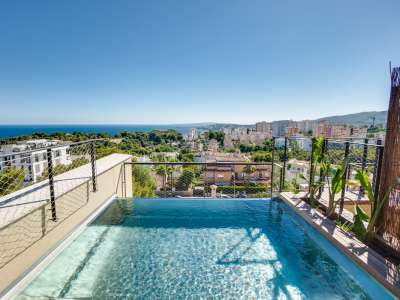 Apartamento triplex en venta en Bonanova (Palma). En la planta principal de este tríplex, hay un vestíbulo, un salón-comedor con vistas preciosas, una cocina equipada con electrodomésticos de la marca Miele, un lavadero y un aseo de invitados. En la planta inferior, hay dos amplios dormitorios dobles con dos baños, uno de los cuales en-suite con una elegante ducha doble y un vestidor. Desde la planta principal, hay un acceso a la terraza superior a través de una escalera de caracol. La azotea ofrece unas vistas panorámicas espectaculares, una pequeña piscina infinita, terraza de la piscina con tumbonas, y una mesa de comedor para 8 personas. El edificio cuenta con alta eficiencia energética, zonas verdes comunales, un gimnasio completo y un diseño en la fachada extravagante. Mas detalles incluyen: Suelos de madera de roble, doble acristalamiento y triple sellado térmico, fachada con protección solar con madera termo sellada, anemómetro para cierre automático sensible al viento, suelos radiantes, aire acondicionado y calefacción con termostatos individuales, consola domótica Zennio de última generación, iluminación LED y mucho mas. La calidad de construcción es muy por encima de los estándares de construcción y va a convencer a los mas exigentes.