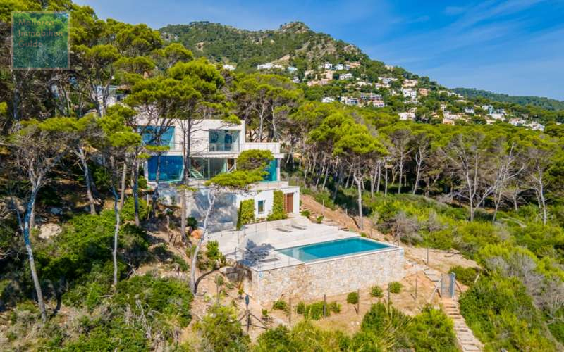 Mas detalles incluyen: suelos de piedra Zarci, suelos radiantes, aire acondicionada integrada, sistema de alarma con video vigilancia, placas solares, descalcificador, riego automático, internet de fibra óptica, cuarto técnico independiente, acceso directo al mar, piscina y sauna.